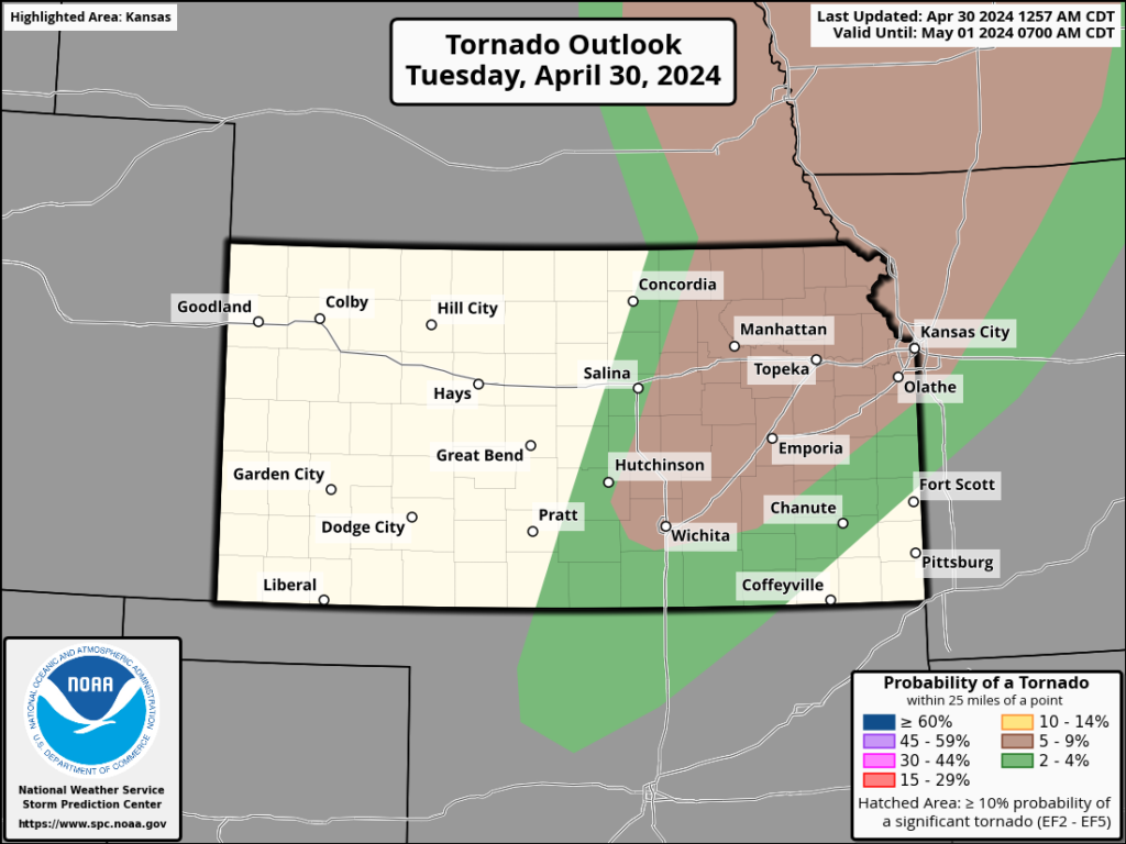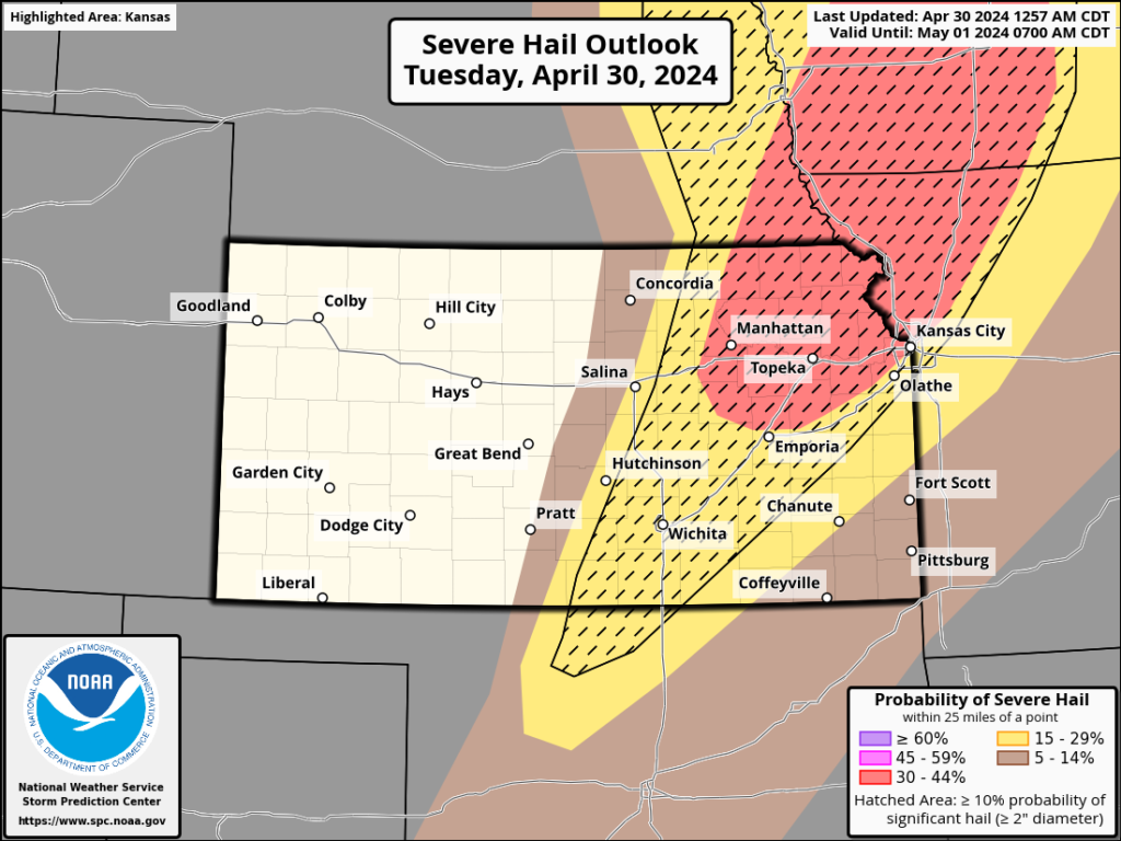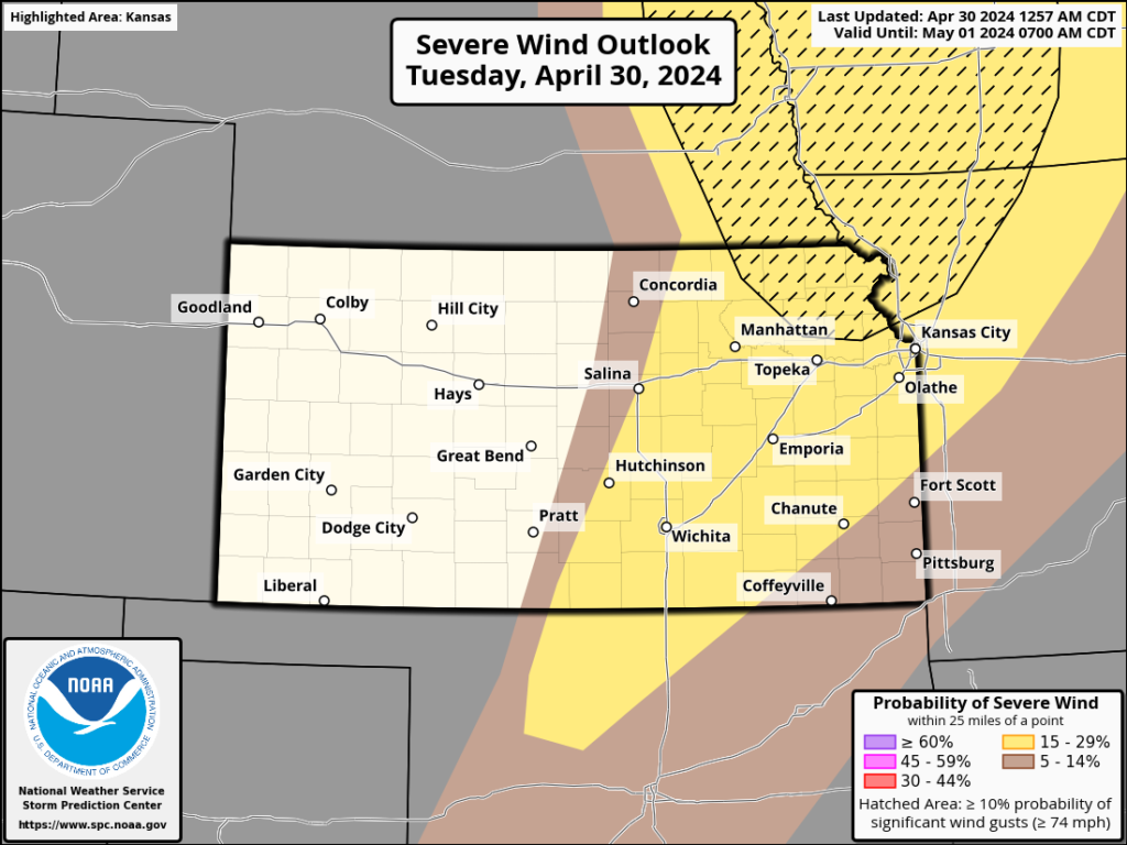 A quick hitting impulse will move across the northern plains today, with a rather weak trough/cold front dropping south into eastern Kansas by this afternoon. This frontal boundary may stall along the Kansas Turnpike and I-35 by this afternoon. Moderate instability and increasing convergence along the front, will probably lead to scattered strong to severe thunderstorms developing along the front, for eastern Kansas and the Flint Hills. The initial discrete storms, have a chance to produce large hail and damaging winds, but current thinking is this strong/severe convection will quickly turn into a line of convection by this evening, and quickly become a damaging wind threat of 60 to 75 mph. There is a “brief window of opportunity” for a tornado with any storm that can stay discrete, early on, given the looping directional wind profile ahead of the front. This chance looks slim at best, but a tornado cannot be ruled out.