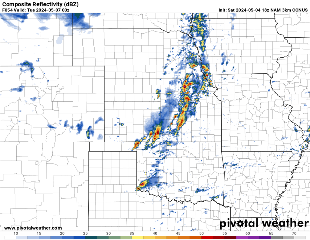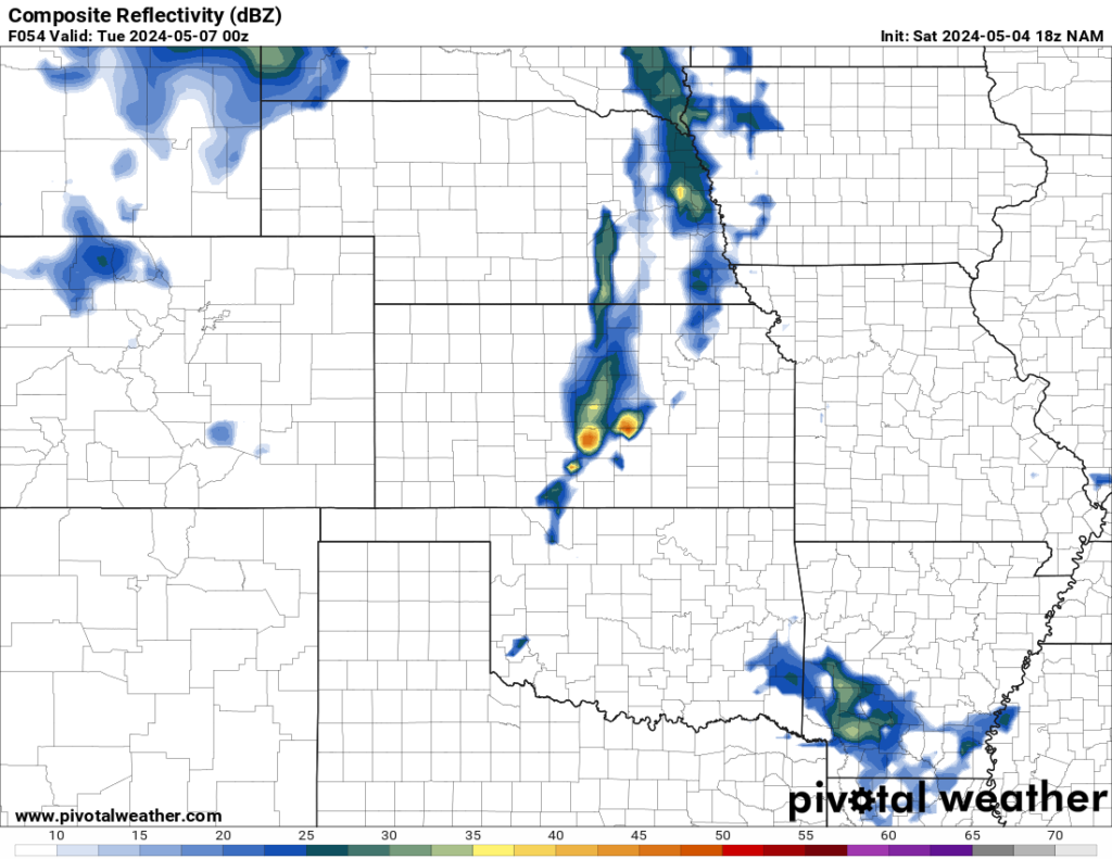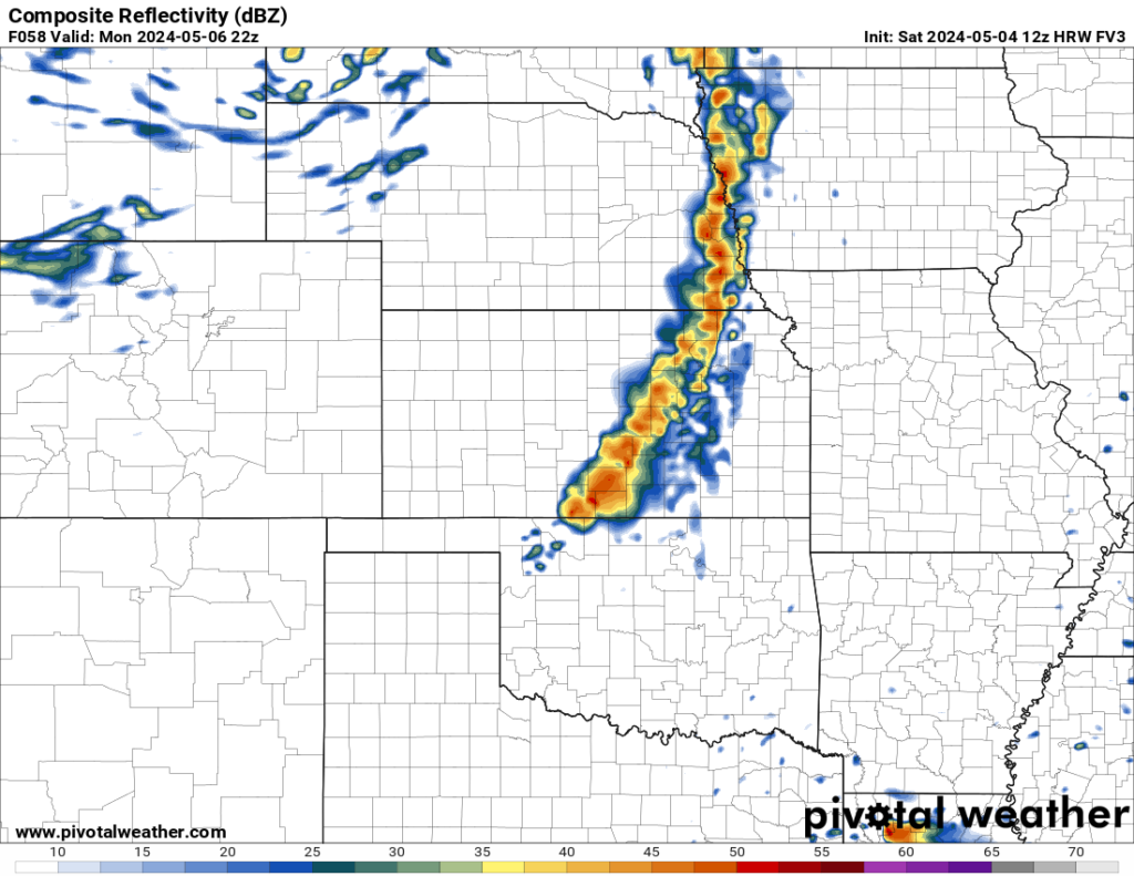 The models vary somewhat in the placement of the best shear. Without jumping way deep in the weeds, at this point we believe if the GFS is closest to reality come Monday afternoon, the main risk will be giant hail in south central Kansas, along with a few tornadoes. If the NAM 3k scenario plays closer to reality, the threat would include large hail, but the chance for strong tornadoes would increase substantially. The FV3 (as Brad calls it “the always-optimistic FV3”) moves from a primarily supercell to a primarily squall line event where rain and hail from one storm “seed” its neighbor, limiting hail size. But a line of decently scattered supercells would potentially spread the larger hail risk out. The thing to watch in a line scenario is what we call “tail-end Charlie,” the southernmost storm which has the best air to feed on.