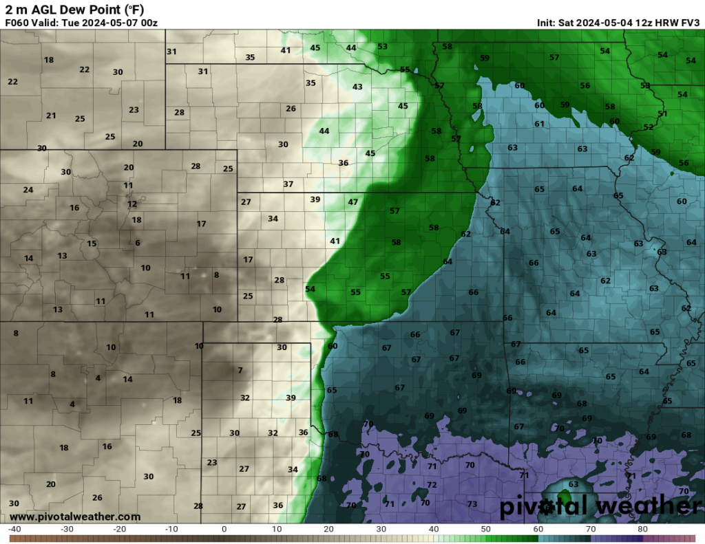 In May, any of the blues and purples in the dew point graphics are enough to get storms going. That means dew points higher than 60 degrees. Later in the month it might take another 5-8 degrees, but right now 60 is decent-quality moisture.