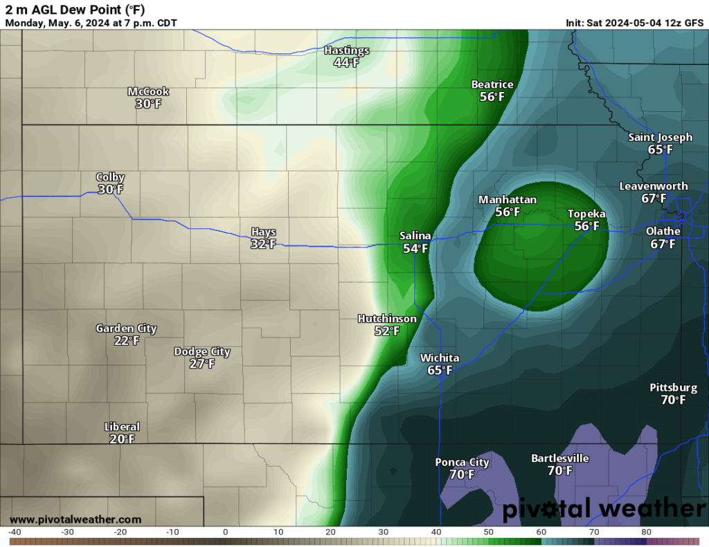 - HRW FVF3: Also showing storms along the boundary between the rich moisture and the lower-quality moisture, with a broad area of 50’s back to Highway 183, or approximately from Hays to Coldwater and then the sudden jump into the 30’s.