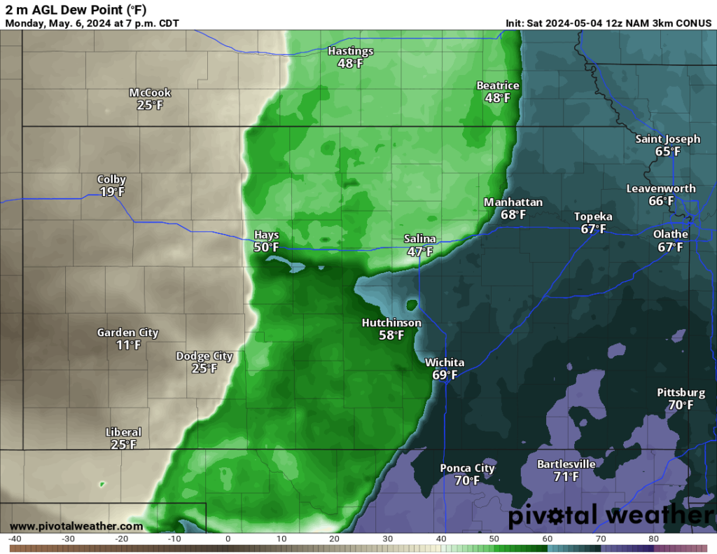 - NAM 3k: Somewhat further west, perhaps as far as a Coldwater to Greensburg to Hays line (US 183). The challenge is, the storms are on the boundary between the rich, mid-60’s dew point air and the mid-50’s air — still somewhat moist. The real boundary to the dry air is many miles west, then we go suddenly from the low 50’s to the low 30’s.