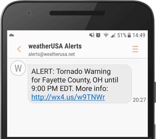 When a severe weather warning includes your location, you will receive a phone call from WeatherCall®. It doesn’t matter what time of day, or if it is a weekend, you will receive a call. You can also receive the warning by email with a detailed map of the threat or by text message. (Information from the WeatherCall® website.)